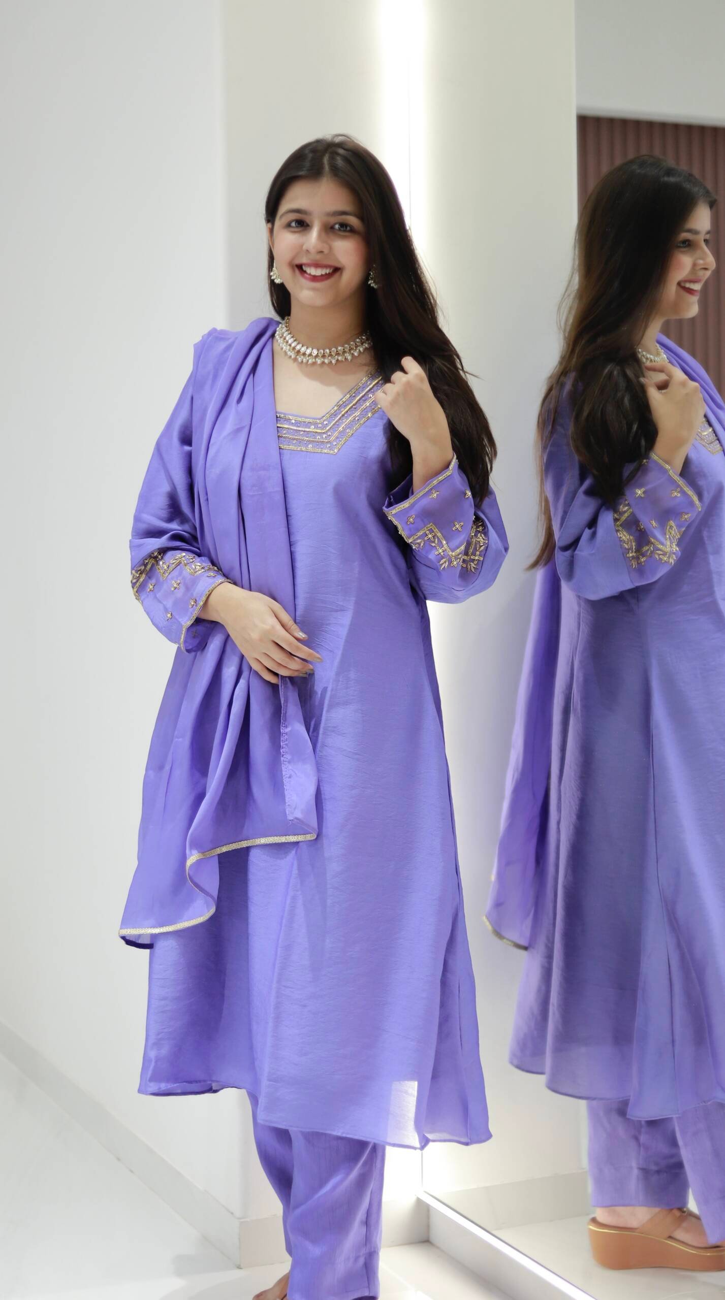 This light lavender suit set is all about delicate charm. The chanderi silk top pairs beautifully with smooth silk pants, offering a blend of comfort and elegance. The organza silk dupatta adds a sheer, flowy layer, while fine hand embroidery brings a handcrafted touch to the whole look. Perfect for daytime functions or relaxed festive occasions.