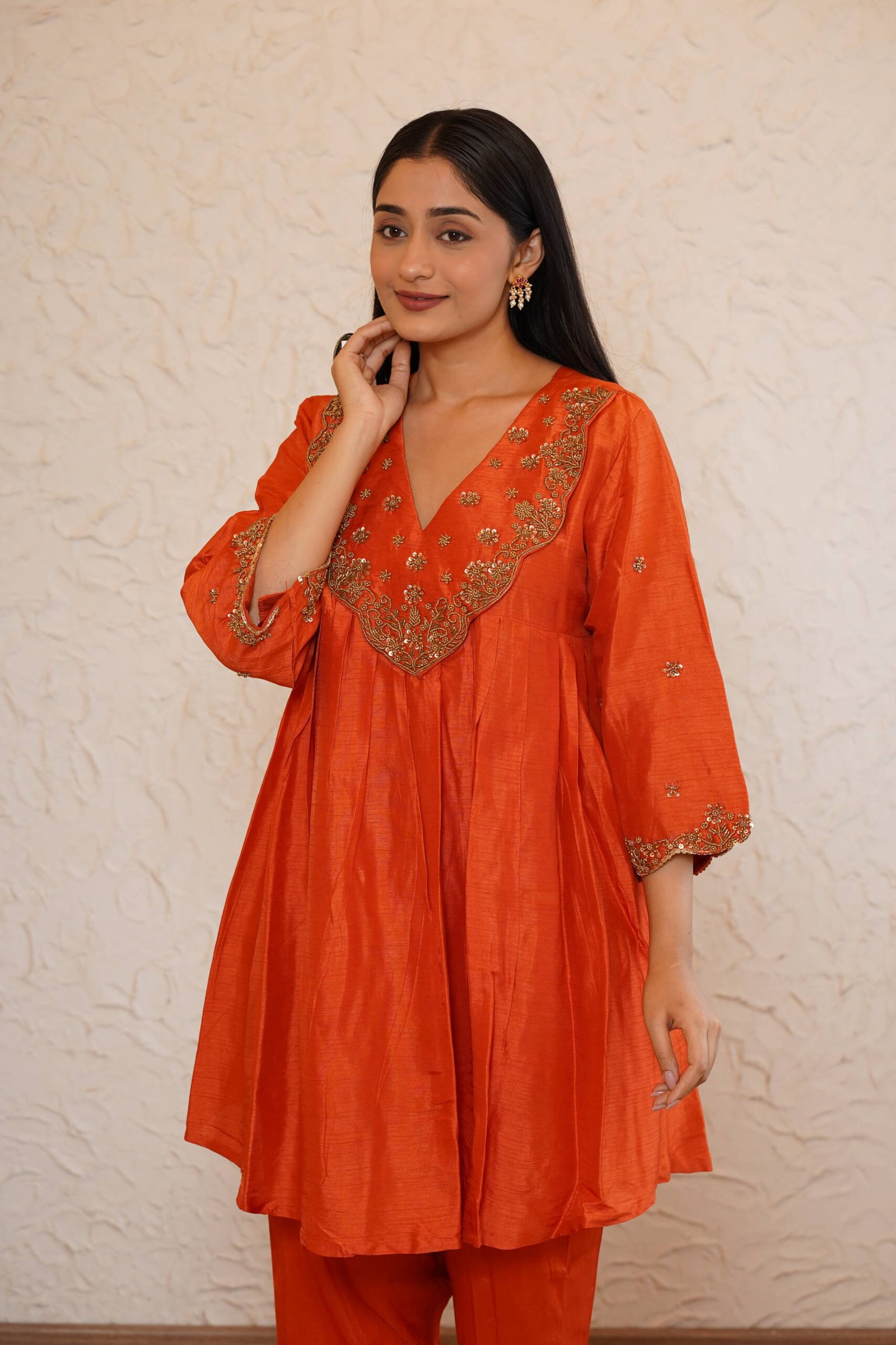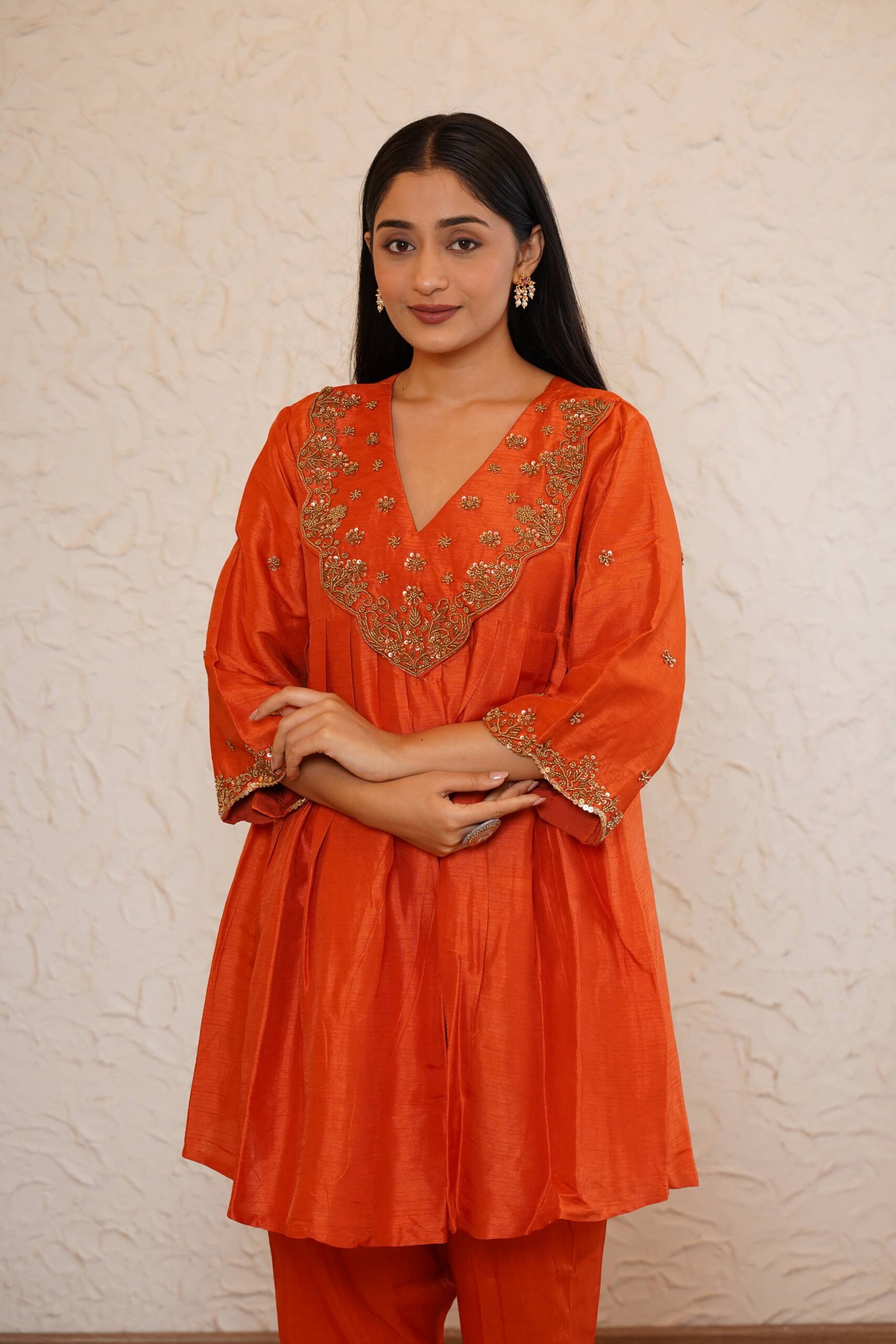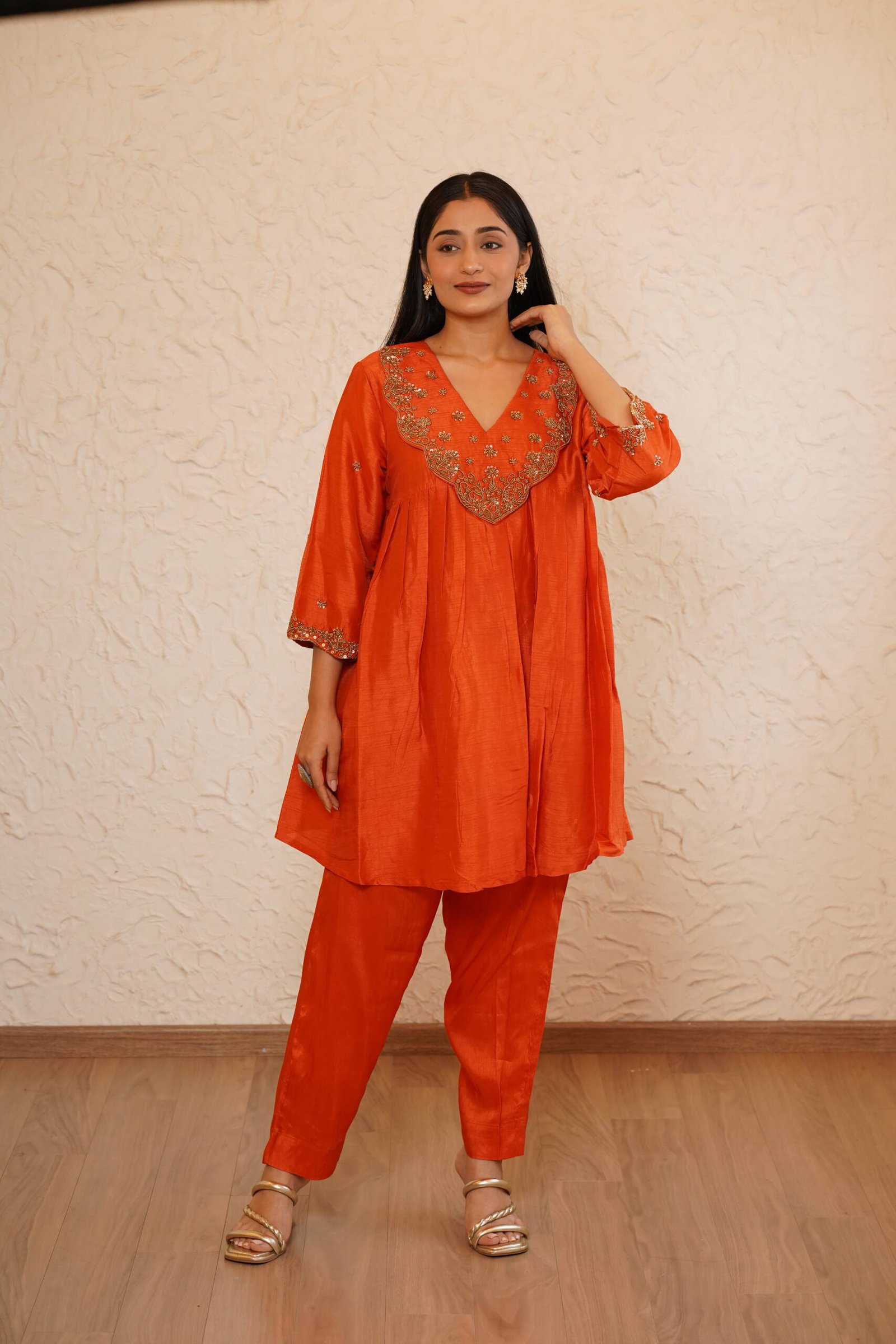 Crafted in premium silk fabric for both the top and pant, this set radiates elegance in a bright orange hue. Intricate hand embroidery enhances its timeless charm, making it perfect for festive and celebratory wear. Available with a quick delivery timeline of 7–12 days, it’s an ideal choice for your upcoming occasions.